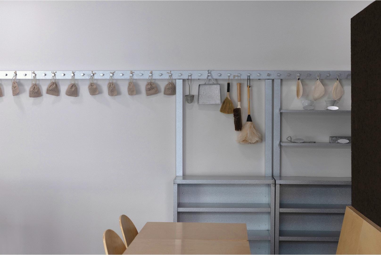공간은 메인 상권과 주거지 사이에 위치하며, 도시의 분주함과 개인의 여유가 교차하는 지점을 설계의 핵심으로 삼았습니다. 내부 마감은 커피가 만들어지는 과정과 그 부산물에서 영감을 받아 구성하였습니다. 다양한 커피 원두의 가루 입자에서 착안한 코르크, 콩자갈, 내부 바닥 마감은 자연스러운 텍스처감을 전달하며, 기능성과 심미성을 동시에 고려한 갈바륨 금속은 공간의 구조적 명료함과 재료 간 텍스처의 통일성을 부각시킵니다.